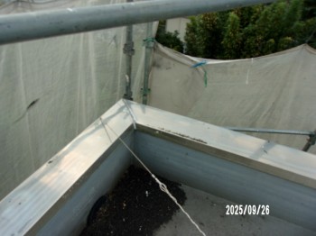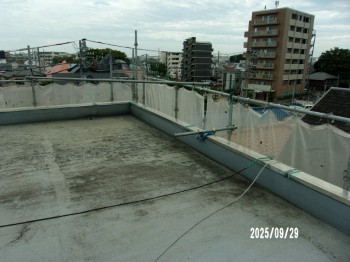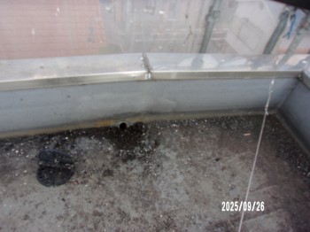 この屋上はドレイン(排水口)が3コなので1コ側の水掃けが良くないので、画像の様に
